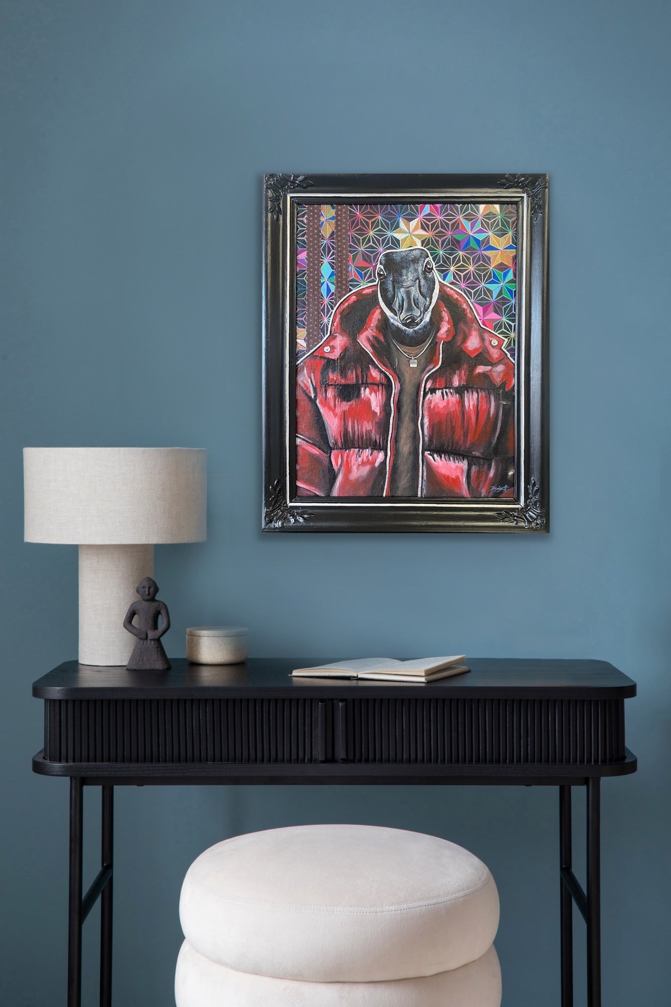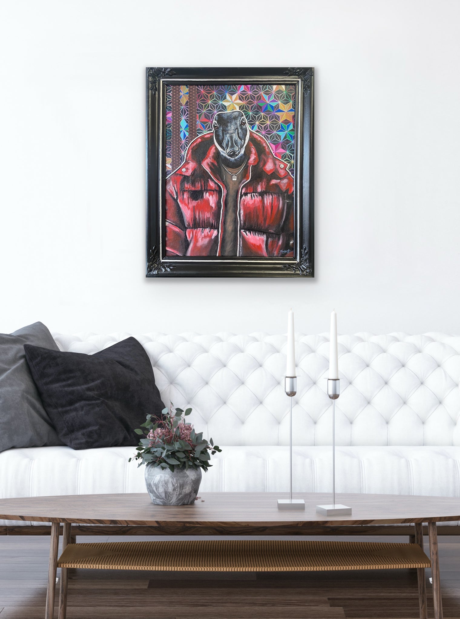 Verket gör sig starkt på en egen väggyta där porträttets uttryck får ta plats. Fungerar även väl tillsammans med annan samtida konst.