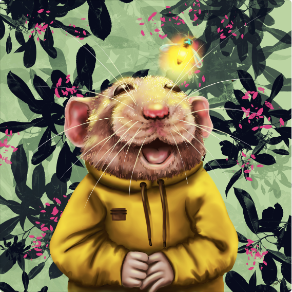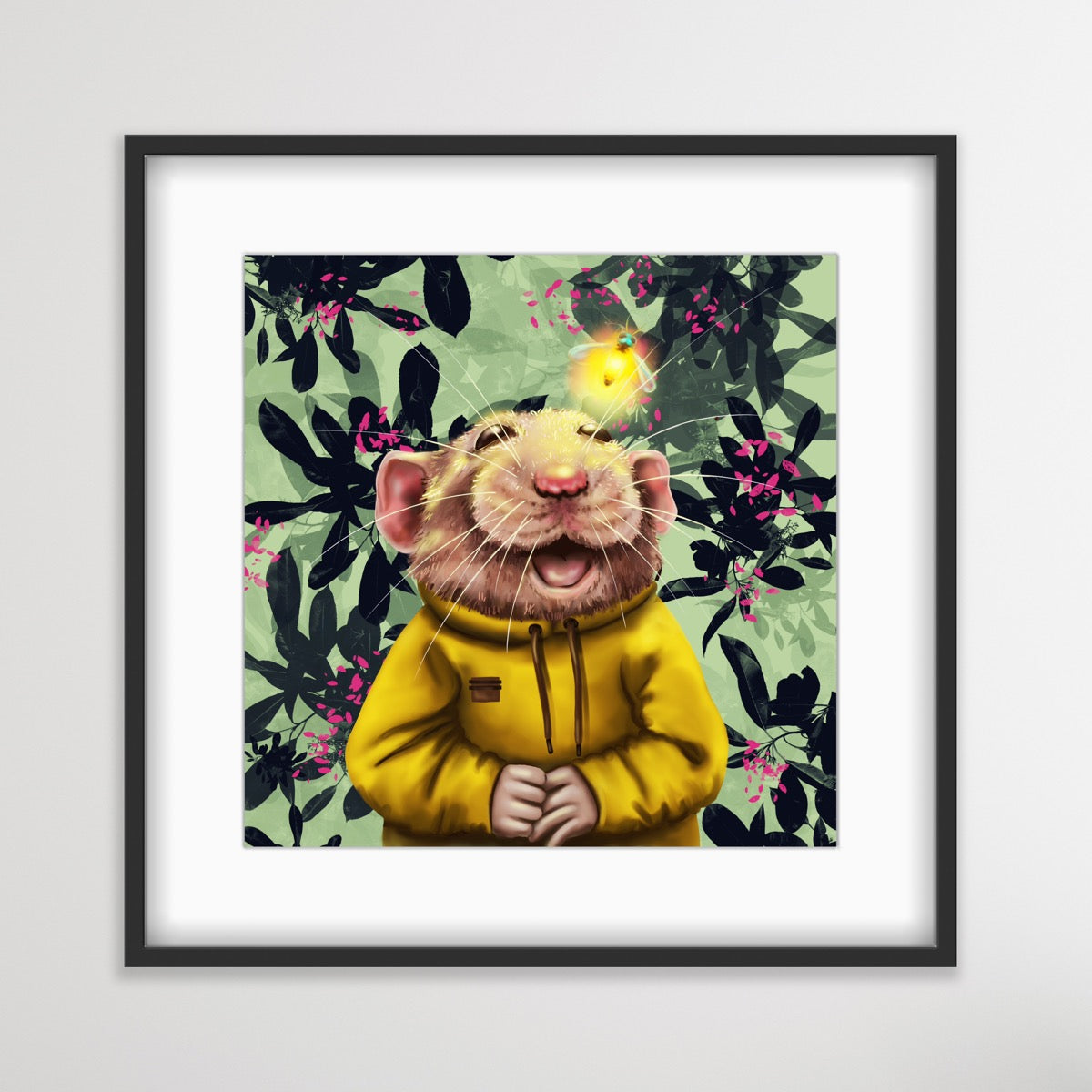 Det här motivet är ett digitalt konstverk från mitt mer serieteckningsinspirerade konstnärskap, och fångar Pipette i ett ögonblick av förundran betagen av en eldfluga.