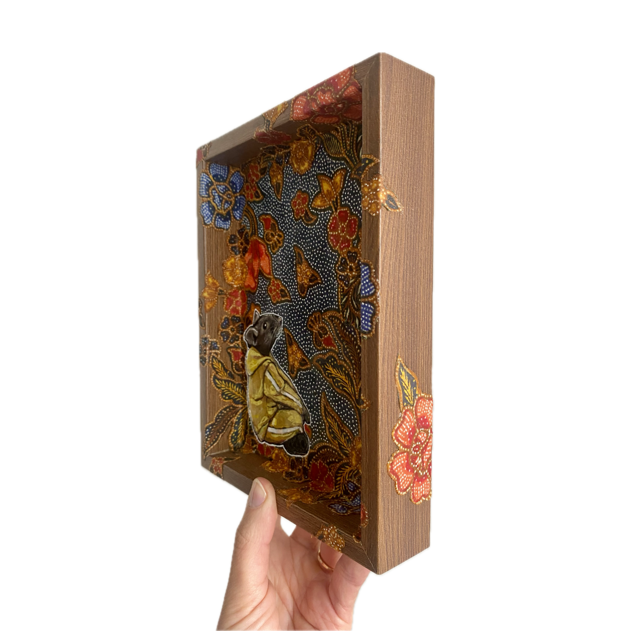"Undisturbed" - är ett handmålat originalverk i blandteknik, utfört på blommigt batiktyg som breder ut sig över en valnötsfärgad träram. I motivet möter vi Råttan Pipette i sitt eget rum av lugn – omgiven av prunkande växtlighet och mystiska fäderfän.